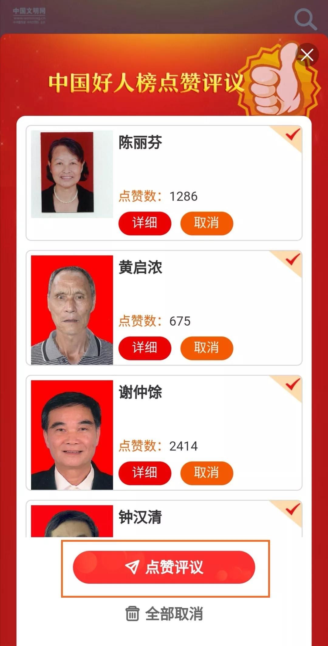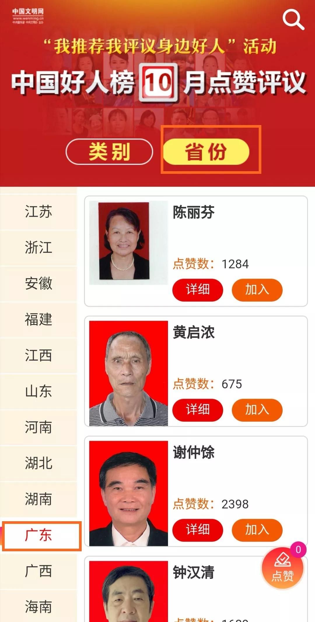 点击候选人旁“详细”按钮查看事迹,并点击右侧“加入”按钮,将心水的好人加入点赞名单。