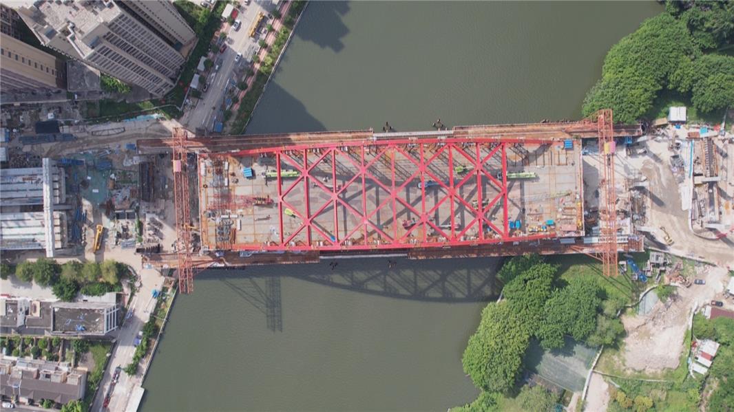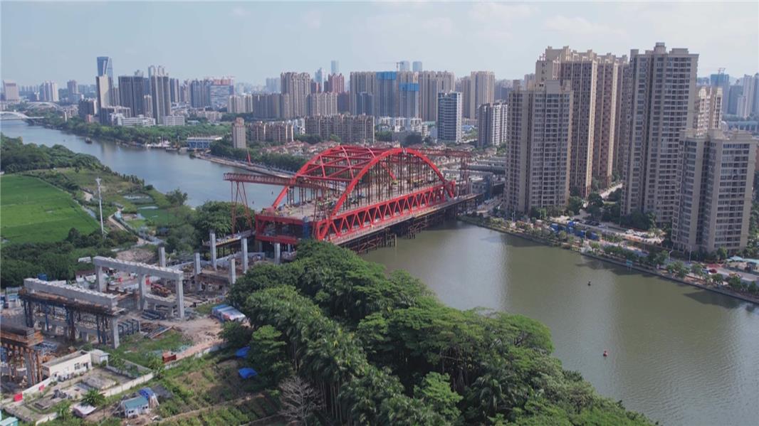 从高空俯瞰,如今的岐江河大桥已初显雏形,犹如一道“彩虹”横跨岐江东西两岸。岐江河大桥全长约1340米,主桥长为153米,结构为双层钢桁架拱桥,下层为南外环路,上层为中开高速,是中山市城区内首座双层桥。目前,岐江河大桥主桥上下层桥及拱肋已安装完成,下一步将开展辅助支架拆除、吊索张拉及桥面施工作业,同时对引桥下部结构、浇箱梁、梁板架等桥面及附属工程施工。
