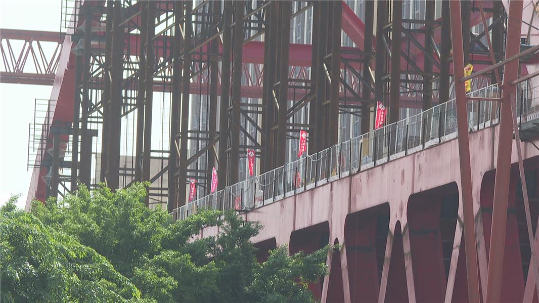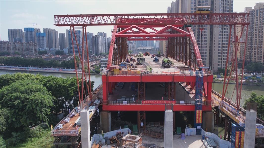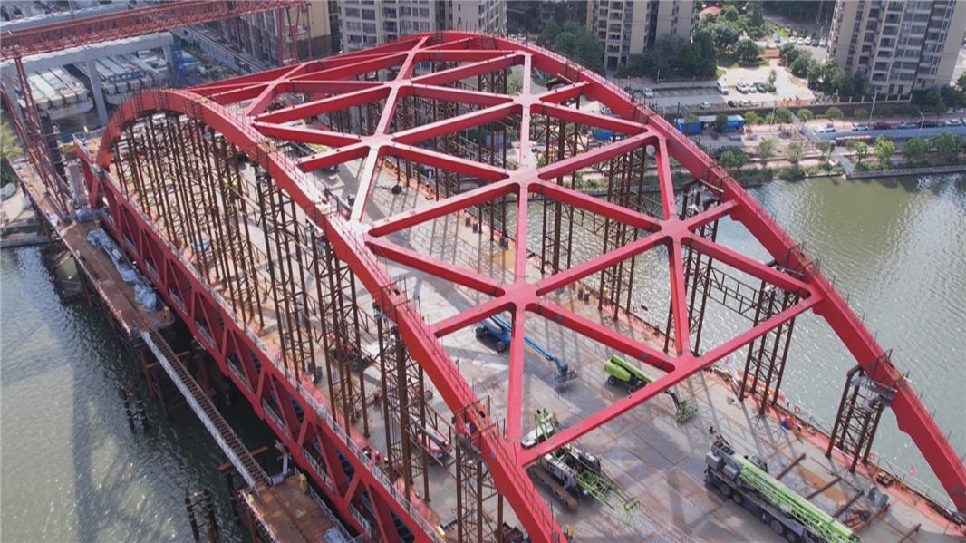 中电建路桥集团有限公司岐江河大桥工区主任卫学捷:“截至目前岐江河大桥已完成上下层桥面以及拱内安装,已完成钢结构工程量的85%,现在正在进行下部结构施工,下部结构完成比例大概在83%。”
