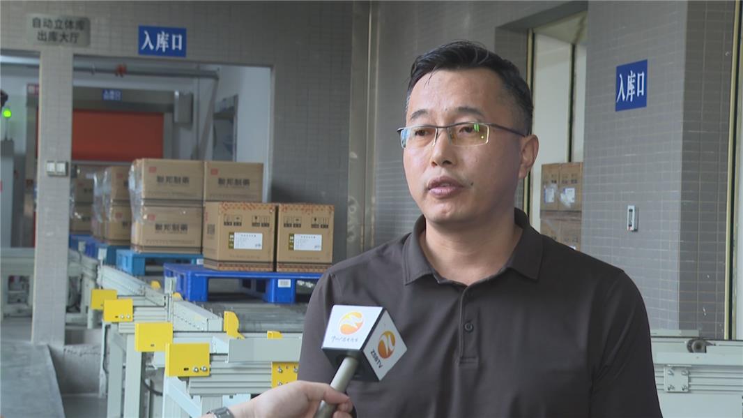 珠海联邦制药股份有限公司中山分公司副总经理丁宇光:“以前,公司的仓储条件是整栋楼的平面仓储,需要的人工较多,劳动力负荷比较大。现在,所有的产品有监管码、流程码,在外包就完成码垛和组团的工作,每一箱和托盘进行组团运输到分拣区,分拣区通过输送带扫码进入立体库。”