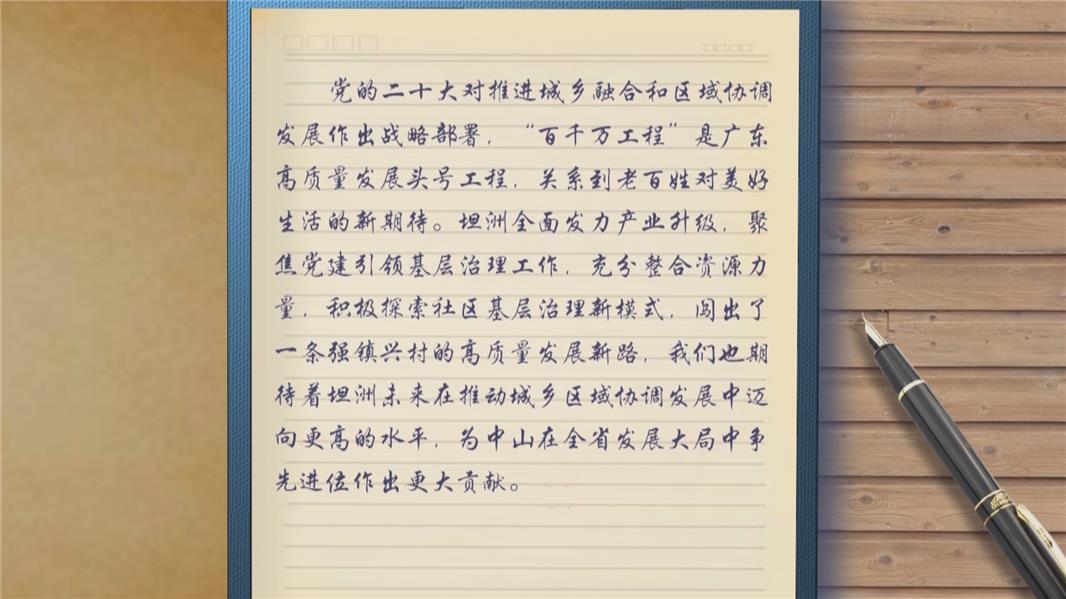 记者宋家宁:“这里是坦洲镇,也是中山南部的经济重镇、人口大镇。乘着‘百千万工程’的东风,坦洲走出了自己强镇兴村的高质量发展之路,全面发力产业升级,建设‘产业新城 品质坦洲’。”