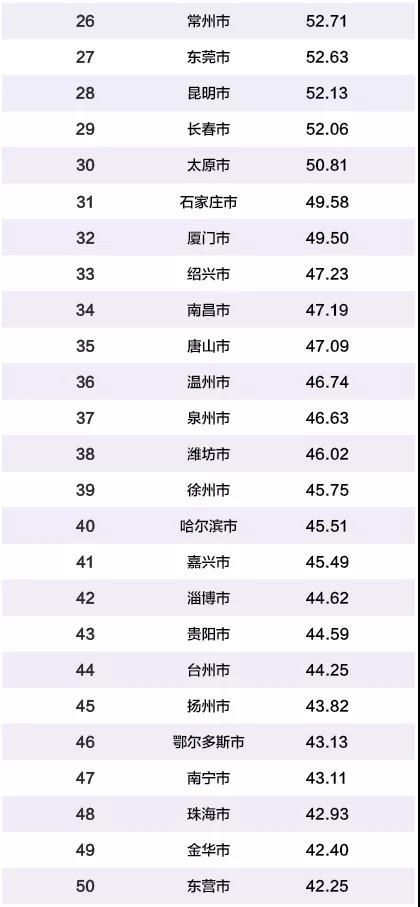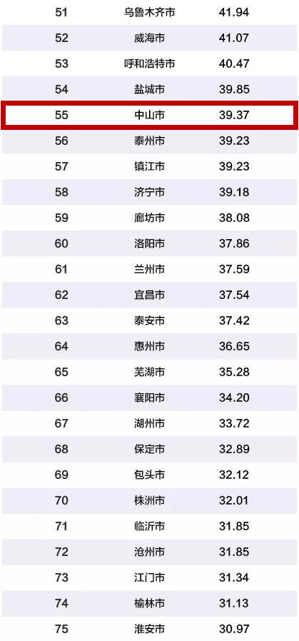 北京、上海、广州和深圳连续五年稳居前四,综合实力最强。其次是杭州和苏州、成都、天津、武汉和南京。中山榜上有名,排在第55位。