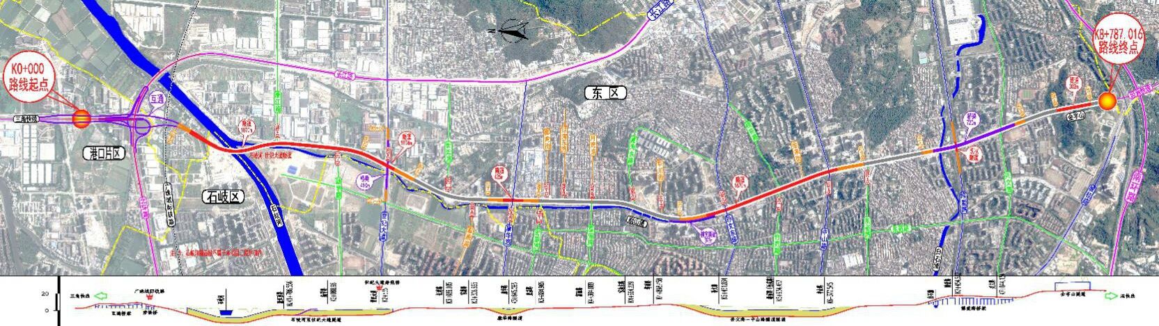 (3)下穿岐江河节点方案为长隧道。隧道全长约2090m,其中:北段长约856m由总部经济区PPP项目实施,剩余南段长约1234m由起湾道项目实施。