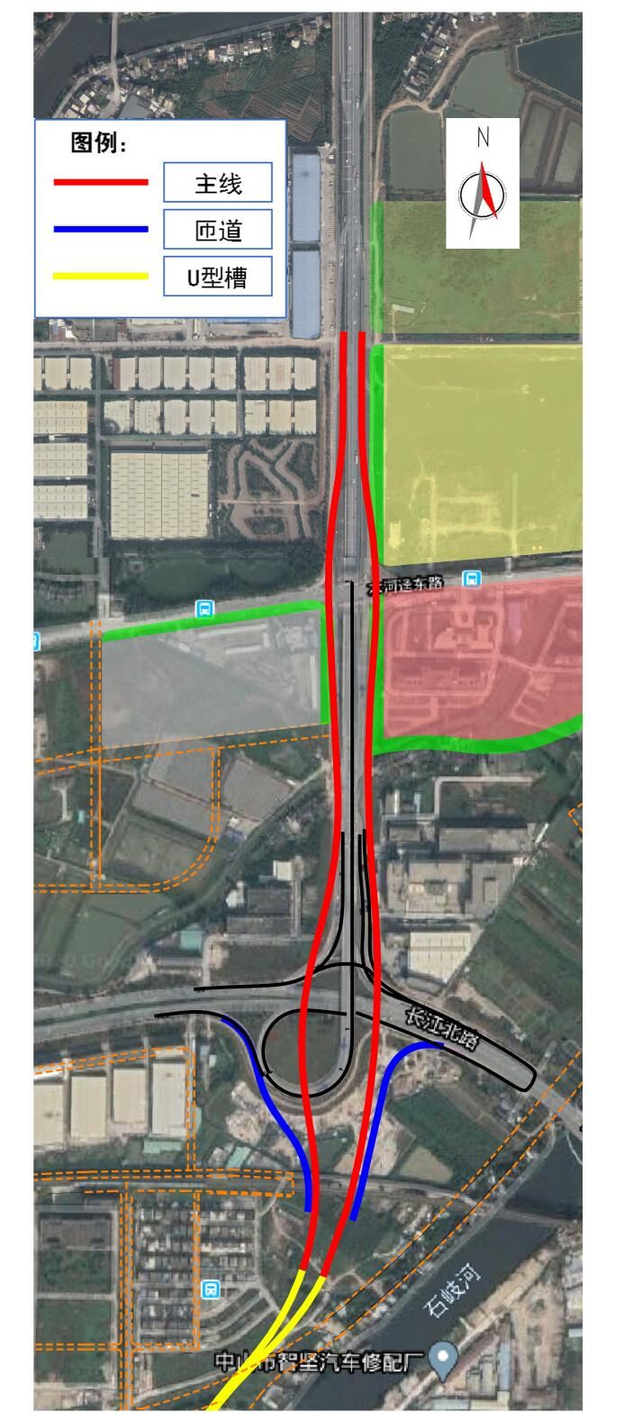 (2)北环互通节点方案:从三角快线两侧的辅道接出起湾道主线,保留现状互通不拆除,增加两条匝道实现北环路与起湾道的交通转换;进、出城方向均采用高架跨过木河迳路平交口。南向西车流通过从长江路桥头下地面辅道调头实现左转,同时出城方向与木河迳路的交通转换通过长江路桥头下地面辅道调头后再右转实现。北环互通平面布置如下图所示:
