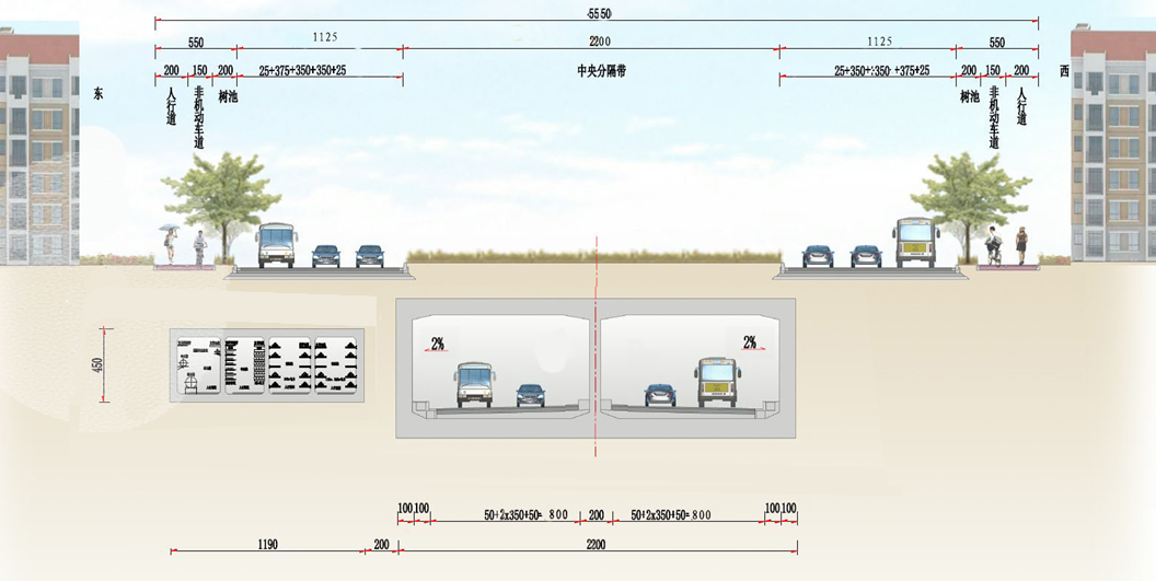 (4)康华路节点方案:采用简易立交;南北向起湾道主线为下穿隧道,东西向康华路为地面层平交。康华路隧道全长490m,其中U型槽段315m,暗埋段长175m。其横断面布置如下图所示: