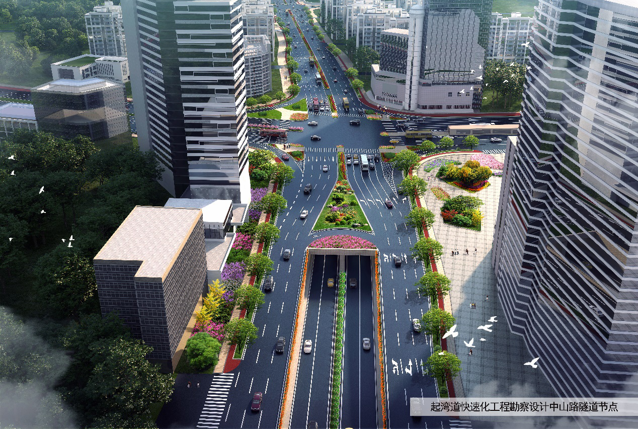 (5)孙文东路~中山路节点方案:起湾道与孙文东路、中山路两条城市主干路交叉节点,均采用简易立交;起湾道主线连续下穿孙文东路、竹苑路(桃苑路)、中山路交叉口,地面层均为平交。隧道全长1620m,其中:U槽段420m,暗埋段1200m。
