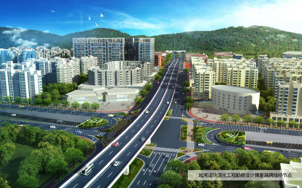 (6)博爱路~兴文路节点方案:起湾道主线采用桥梁连续上跨博爱路、兴文路,桥梁全长727m;在博爱路交叉口,东西向博爱路主线为现状隧道,南北向起湾道主线为桥梁,地面层为平面交叉;在兴文路交叉口,南北向起湾道主线为桥梁,地面层为平面交叉。