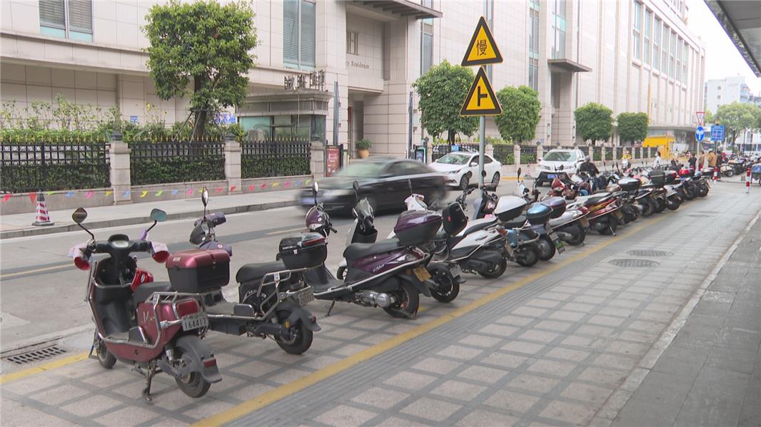中山市公安局交警支队城区大队机动中队民警 邹俊:“基本上在人行道附近适合停放,摩托车和电动自行车的地方都有划线并标示有箭头,希望大家按要求停好车,规范、有序地把车停到方格内,把车头按箭头方向停好。”