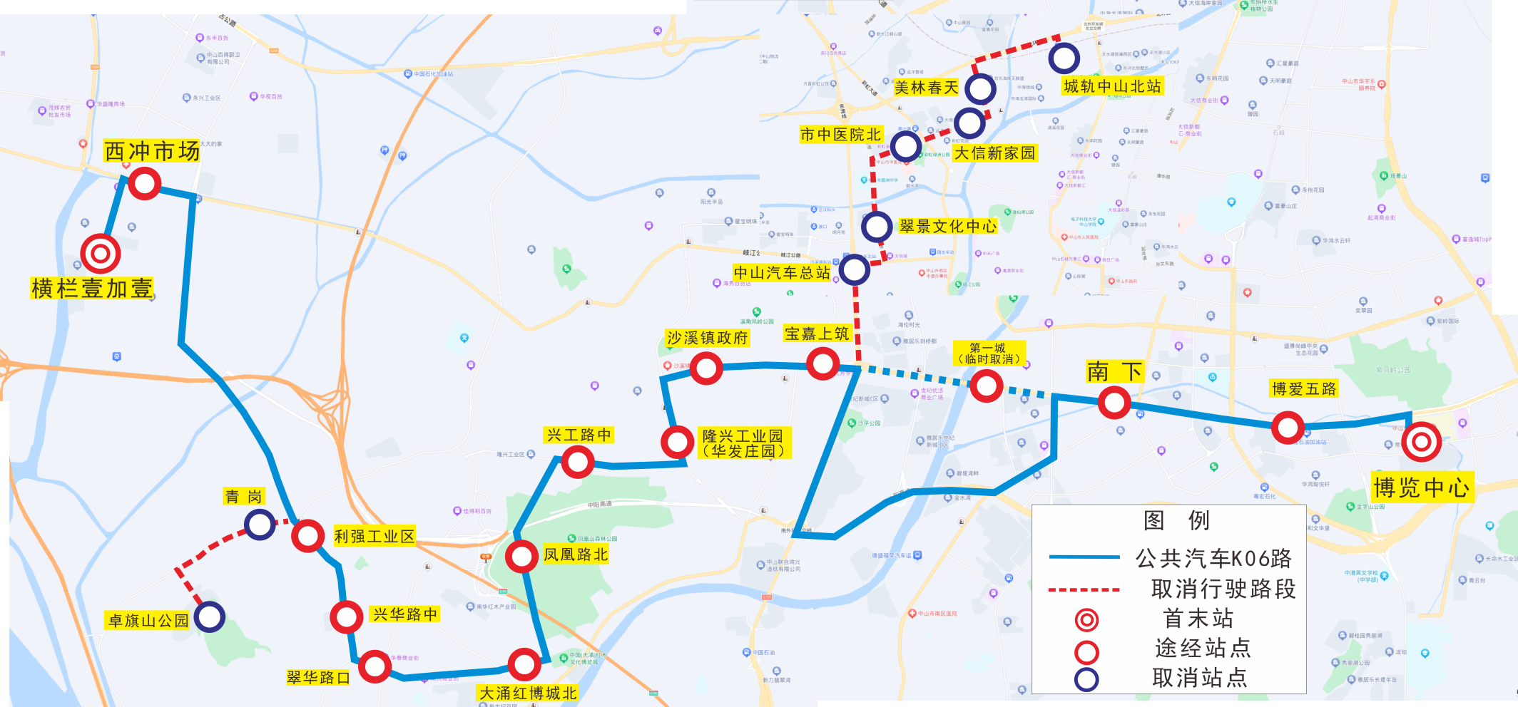 ●途经站点新增博览中心、博爱五路、南下、第一城(中山二桥维修,临时取消)