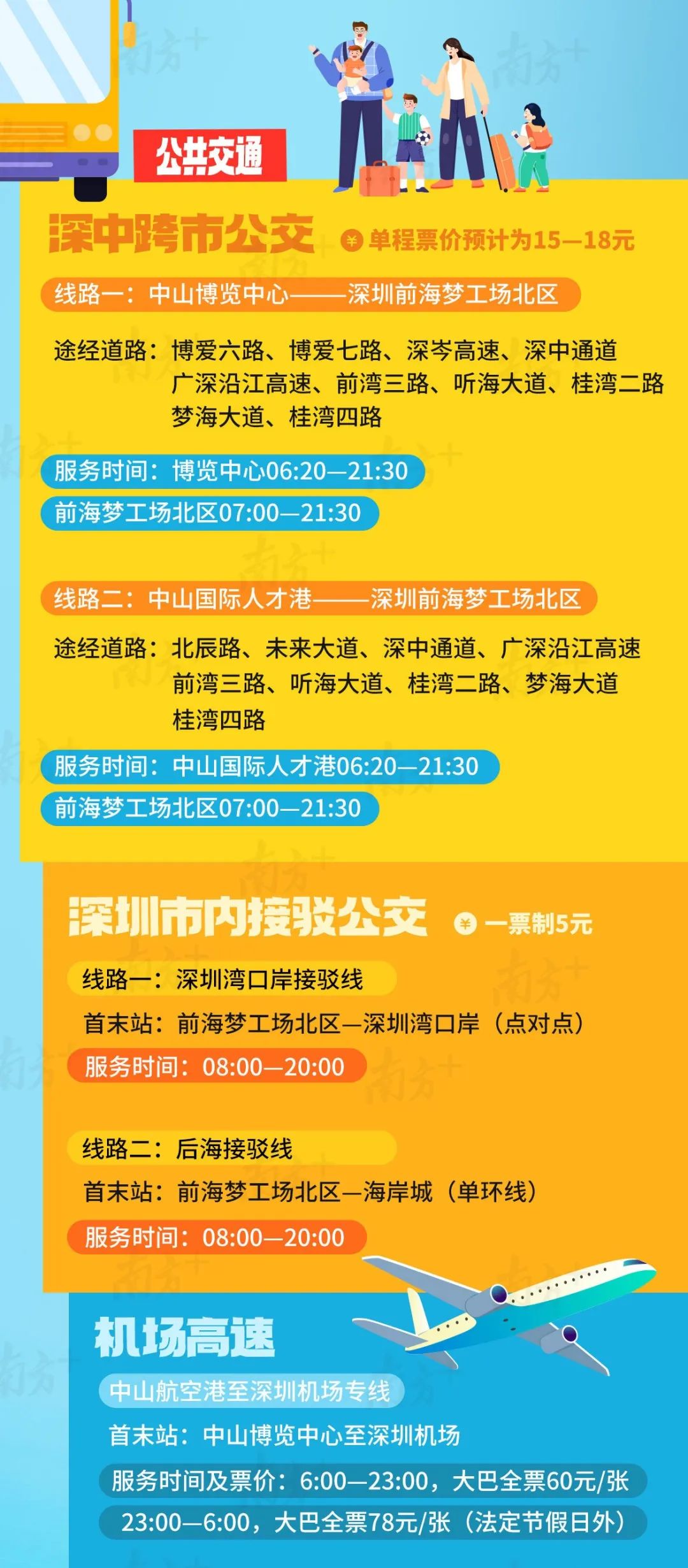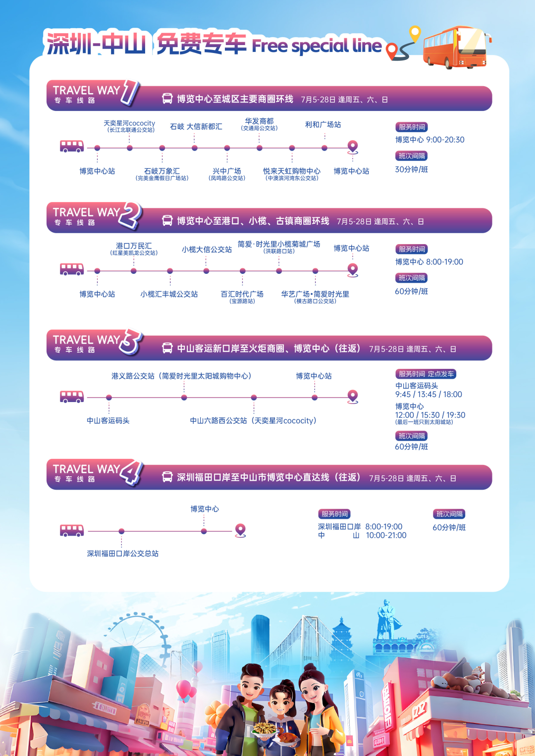 7月5日至28日的每周五、六、日,“深中新通道 香山新体验”中山消费月活动还将开通深圳福田口岸—中山博览中心的免费专线,以及从中山博览中心、中山客运口岸到市内重点商圈的免费专车。