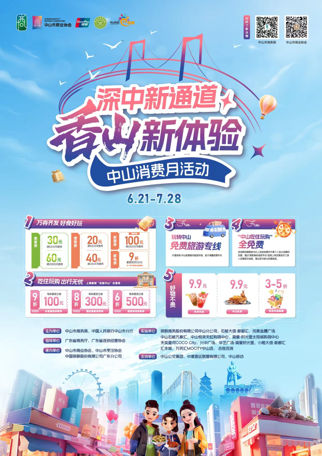 不仅如此,“深中新通道 香山新体验”中山消费月还推出了涵盖吃、住、玩、购四大方面的消费优惠活动。市民游客可以在携程平台领取住宿折扣券,在云闪付平台领取餐饮、零售满减券和家电、家居以旧换新消费券。