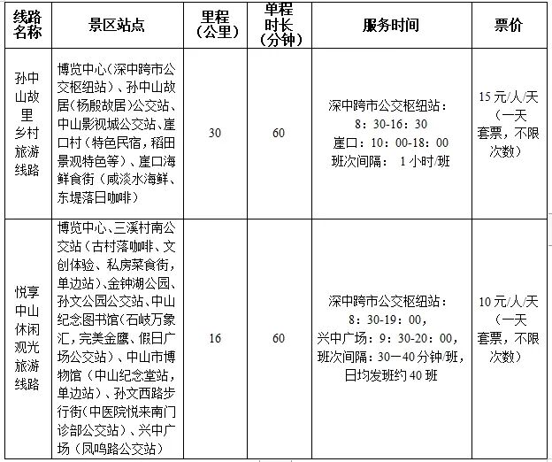 中山公交集团按照景点分布位置,联合市文旅局、交通局等,制定了孙中山故里乡村旅游和悦享中山休闲观光旅游两条线路,线路实行日票模式,票价分别为15元和10元,乘客可持当日乘车电子票不限次数乘坐旅游公交专线。