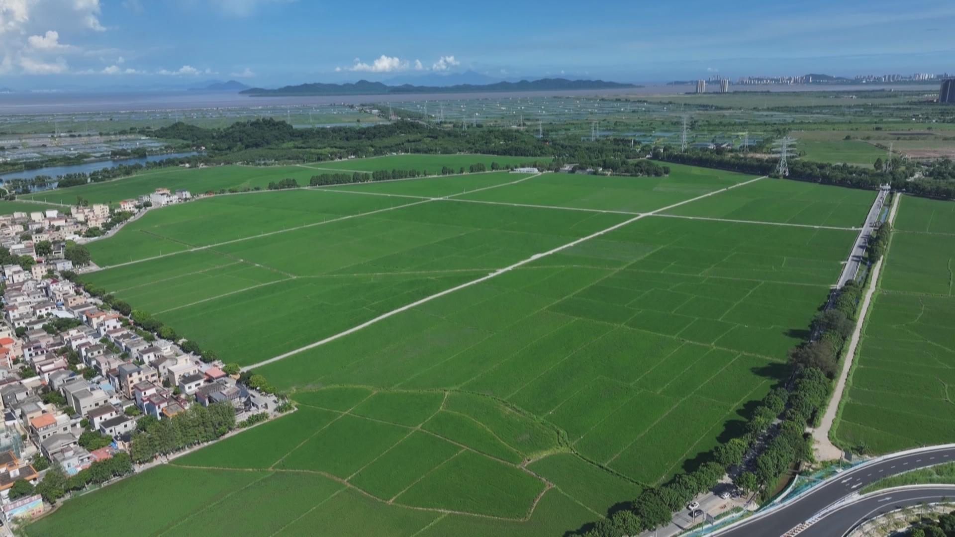 在中山的乡村,蓝天白云之下,微风与这一大片郁郁葱葱、生机盎然的稻田相映成趣,共同勾勒出一幅自然和谐的风光画。