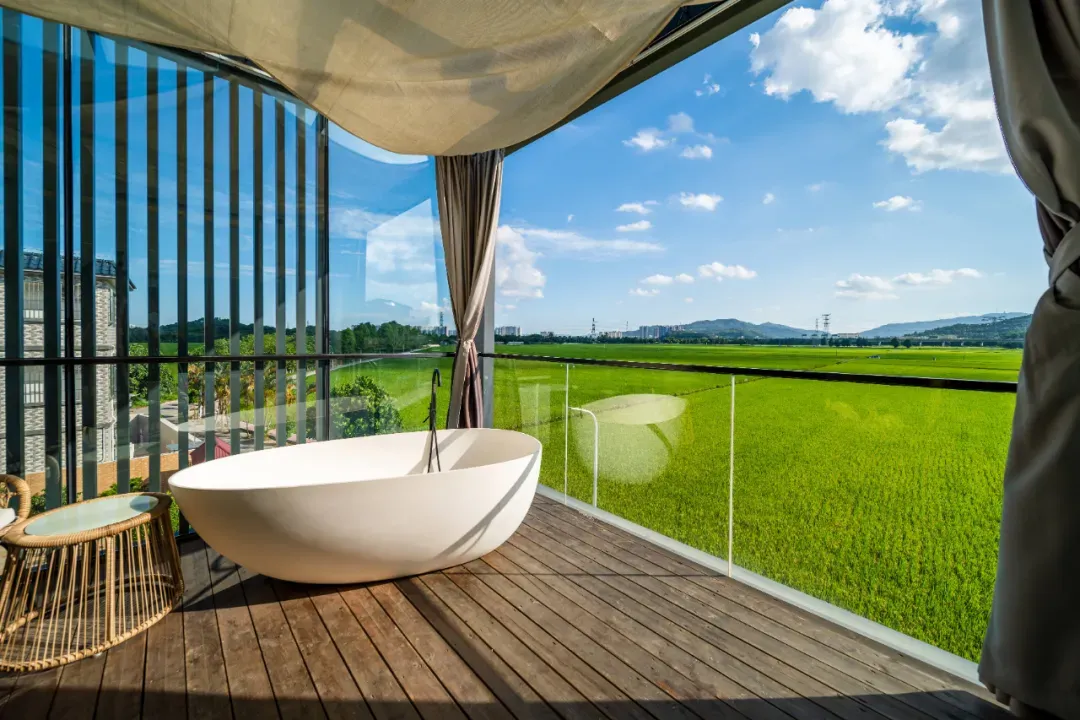 房间的大落地窗正对着一大片稻田