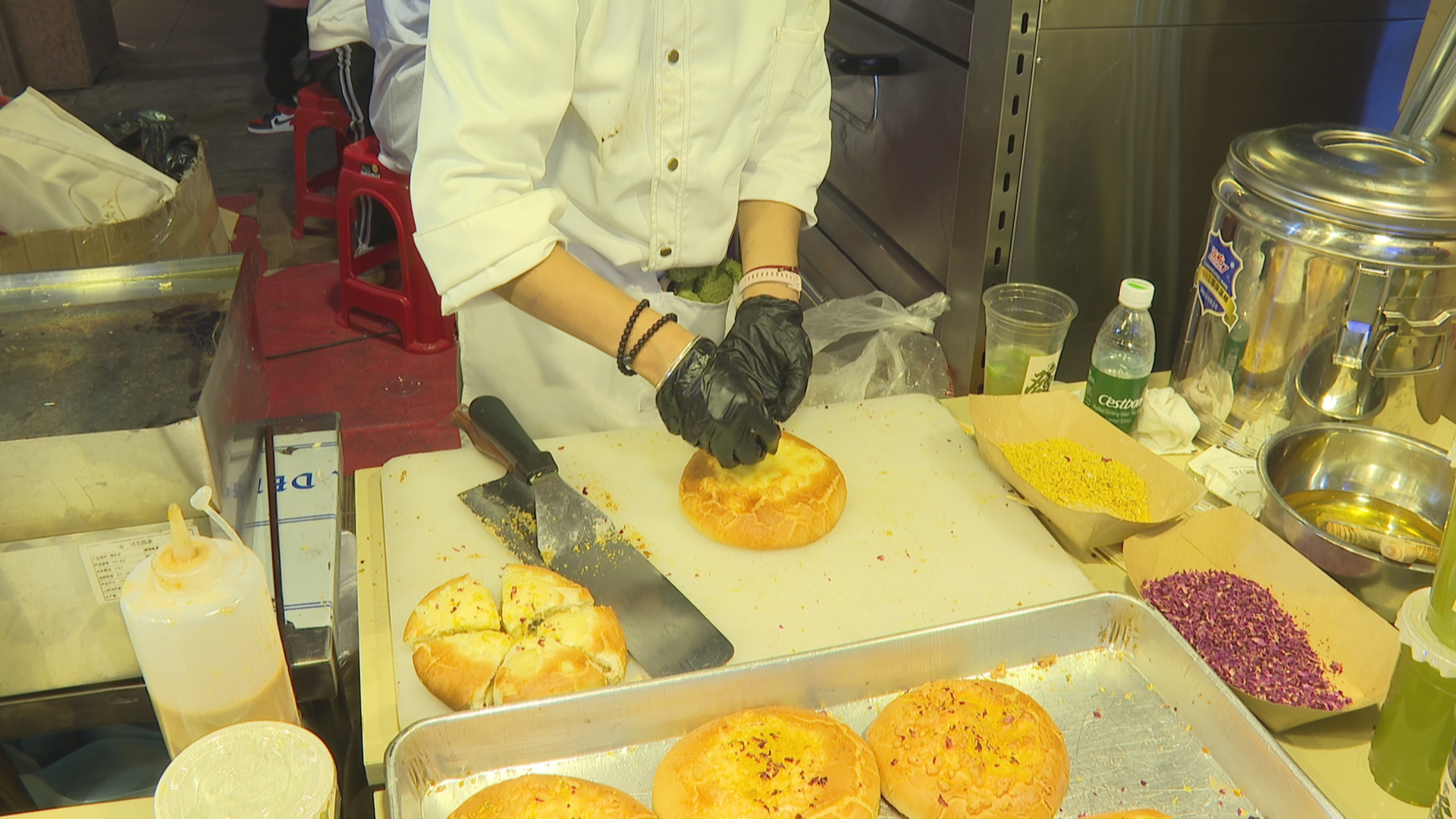 游客冼先生:“好吃,有菊花的香味,还有这个面包烤的也非常的美味,也挺香、挺脆口的。”