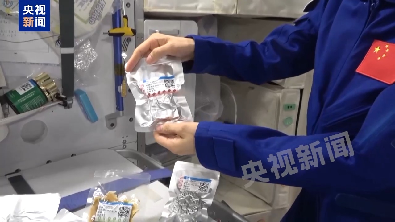 航天员 王杰:有美味白灵菇、油焖笋、豆腐卷、肉末香菇、虾球马蹄。还有一些副食,素米粉、太空香粽、桂花芝士年糕。