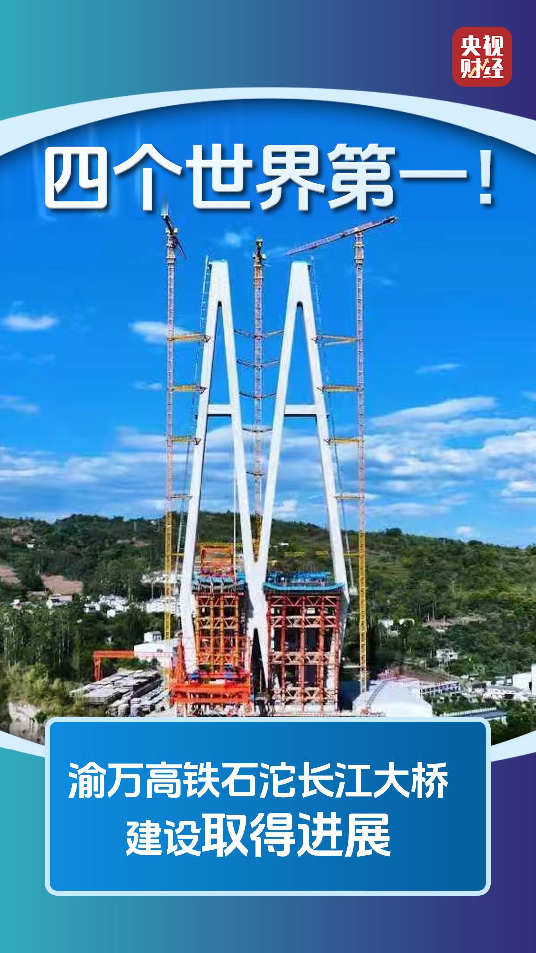 石沱长江大桥正线长度1416.9米,是渝万高铁项目建设关键节点及控制性工程,大桥建成通车后,将创下四个世界第一:世界首次采用公铁合建双联塔、世界首次采用公铁同层分幅主梁,6#主塔高253米,是世界最高双联主塔;主跨跨度608米,是世界最大公铁合建同层分幅混合梁斜拉桥。