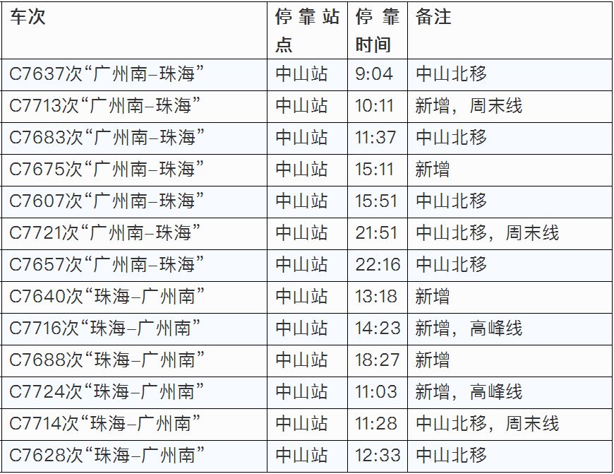车次C7637次“广州南-珠海”、C7713次“广州南-珠海”、C7683次“广州南-珠海”、C7675次“广州南-珠海”、C7607次“广州南-珠海”、C7721次“广州南-珠海”、C7657次“广州南-珠海”、C7640次“珠海-广州南”、C7716次“珠海-广州南”、C7688次“珠海-广州南”、C7724次“珠海-广州南”、C7714次“珠海-广州南”、C7628次“珠海-广州南”。